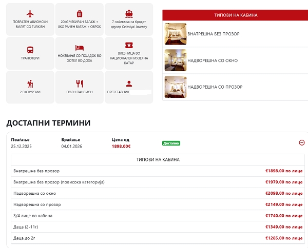 Пристигнување на крузерот : 09:00ч.