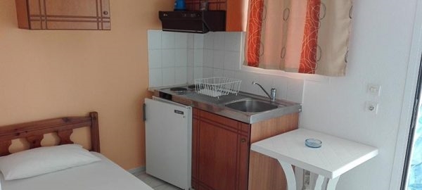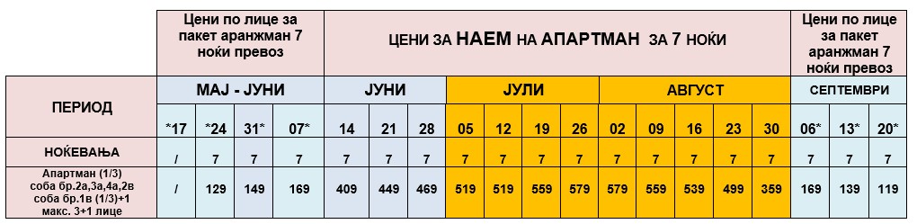 Апартманот располага со две простории. Првата просторија е кујната која е комплетно опремена со кујнски инвентар,решо со две рингли, аспиратор, фрижидер и има 1 поединечен кревет. Во втората просторија има 2 поединечни кревети со можност за дополнителен кревет, плакар за алишта, тв, клима и излегува на тераса на која има маса со столици и тенда, со поглед во убавата градина. Помеѓу двете простории нема врата. Има комарници и ролетни на прозорите .Апартманот располага со стандардно купатило и вц.