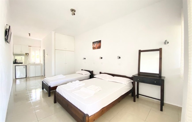 Студиото може да прими најмногу три возрасни и дете и располага со брачен и единечен кревет, чајна кујна и бања.