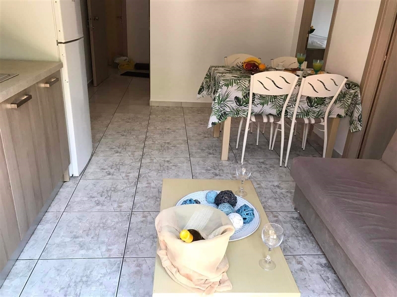 Апартман број 1Б (1/3 + 1)– прв кат, голем простран апартман. Има поглед кон улица и страничен поглед море. Има спална соба со брачен кревет и во кујна помал кревет (наменет за две деца или еден возрасен). Опремен е со квалитетен мебел, сопствен тоалет, одлична кујна со сите потребни елементи (голем фрижидер, шпорет итн.). Има голема тераса со маси и столови.