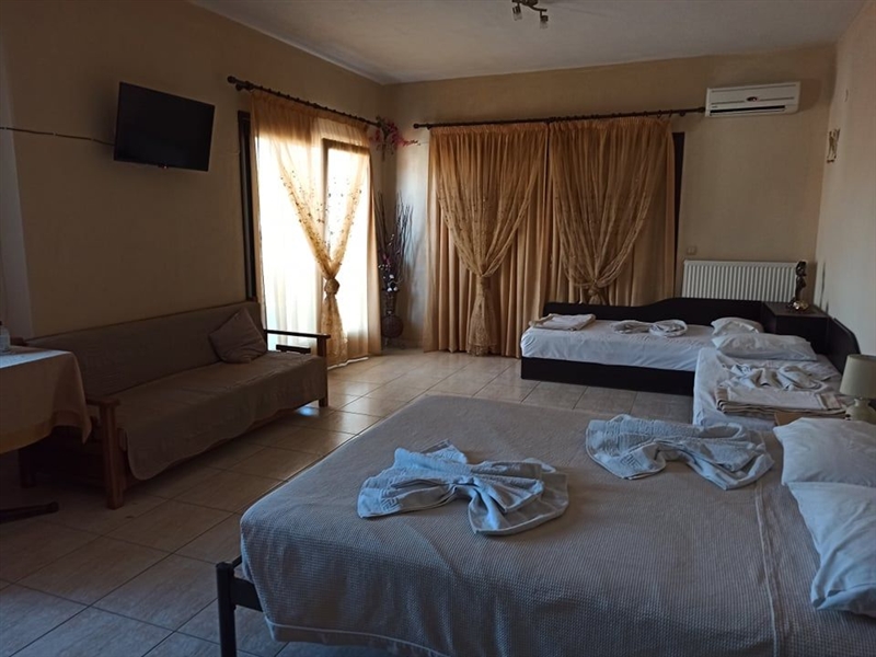 Студио број 4 (1/4) – многу пространо студио со огромна тераса (страничен поглед море), целосно опремена кујна, квалитетен мебел и сопствен тоалет. Располага со брачен кревет, 2 стандардни кревети и софа.