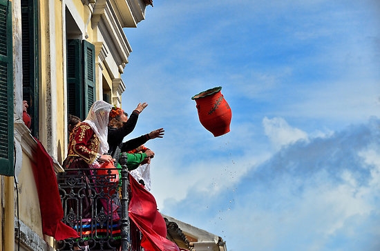 Луѓето фрлаат големи глинени садови полни со вода од нивните балкони, додека толпата го гледа спектаклот и филхармонијата на островот како играат религиозни маршеви. Овој обичај потекнува од венецијанската окупација, кога луѓето ги фрлале своите стари работи од балконите во новогодишната ноќ, очекувајќи од новата година да им донесе нови работи. Според други, овој обичај потекнува од античко време, кога луѓето во април ги фрлале старите глинени стомни, за да ги наполнат новите со овошје. Трето објаснување за овој обичај е дека има паганско потекло и дека со вревата направена од кршењето, Античките Грци сакале да ја разбудат Персефона, божицата на пролетта и да го забрзаат нејзиното доаѓање. Обичајот е да се земе парче од скршените глинени садови и да се сочува за среќа и здравје до следната година. Филхармонските групи се враќаат на улиците и почнуваат да свират весела музика. Како и да е, сè уште е многу популарен обичај на Крф! Во исто време, обичај, наречен „Мастела“, се одржува во областа Пинија, во центарот на градот на Стариот град. Покрај патот е поставено големо буре полно со вода. Секој што поминува треба да фрли паричка во неа. Кога ќе се случи „Првото воскресение“, се избира случајно лице кое минува да биде фрлено во бурето, за да ги собере монетите од неговото дно. По настаните враќање Слободно време за одмор и индивидуални активности.Во вечерните часови, поаѓање кон градот за проследување на последниот дел од традиционалната прослава, односно Христовото воскресение. На полноќ, илјадници луѓе се собираат на градските плоштади и го прославуваат Христовото Воскресение. Честит Велигден, Христос воскресе!