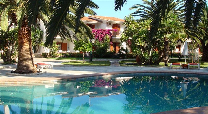 Хотелски соджини: Се состои од главна зграда во која се наоѓа Рецепција со Lobby bar и Ресторан, голем хол со фотељи каде гостите си го остваат багажот на денот на сместување и заминување со бесплатен Wi-Fi интернет. Неколку вили од кои секоја oд по 4 до 6 студија на приземје и 1-ви кат, опкружени со преубаво уредениот, огромен двор со многу зеленило, палми, трева, голем и мал (детски) базен, со лежалки, бар за пијалоци покрај базенот, игачки за деца.. Идеално место за одмор и релаксација. Во непосредна близина на хотелот се наоѓа пекара, маркет и ресторани за брза храна.